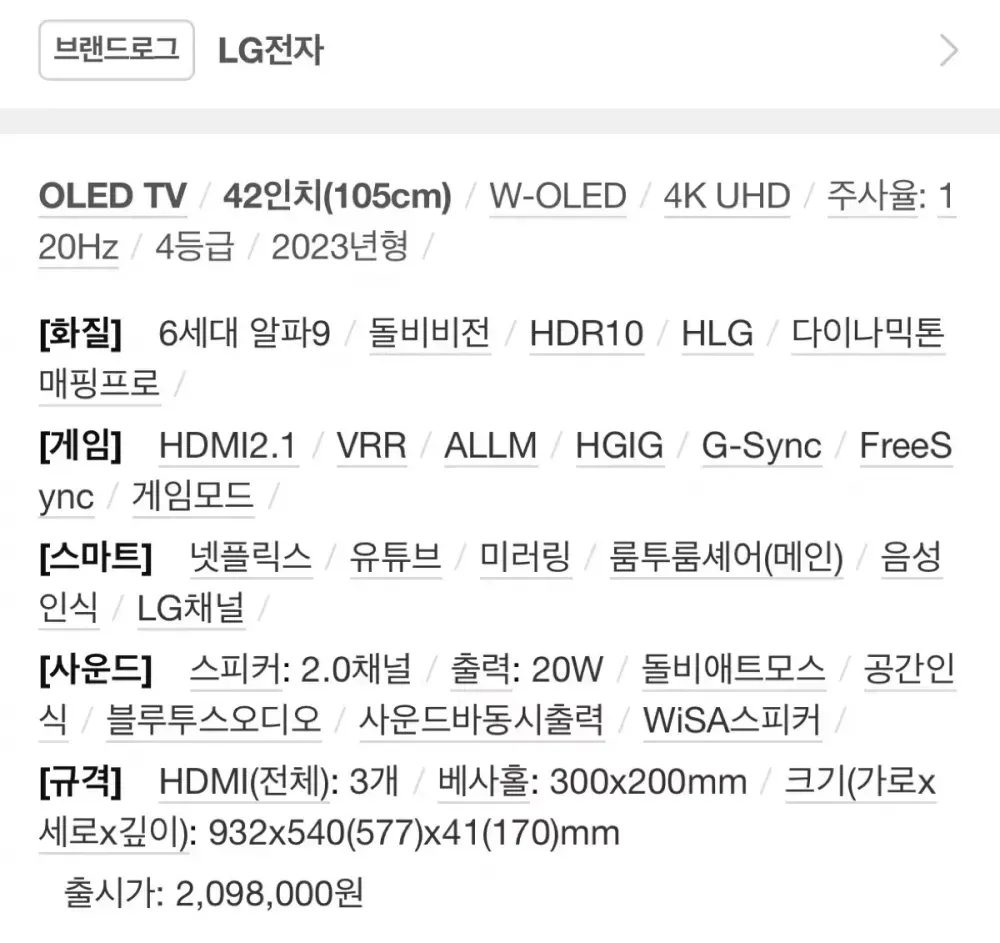 LG OLED TV 42인치 요약정보 및 구매